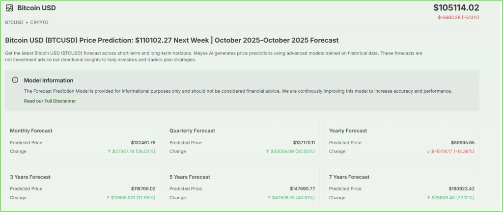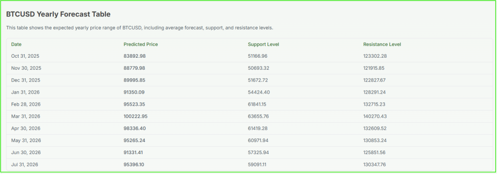 Longer-term forecasts from Meyka use AI models and historical data to set a range of likely outcomes. Their estimates show possible monthly upside targets above $130,000 in bullish scenarios, while medium-term paths can include corrective windows before higher highs.