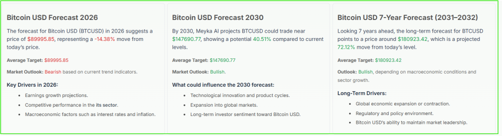 Meyka’s AI-driven forecast suggests Bitcoin could reach around $132K in the short term and potentially over $147K by 2030, depending on macroeconomic and institutional factors.