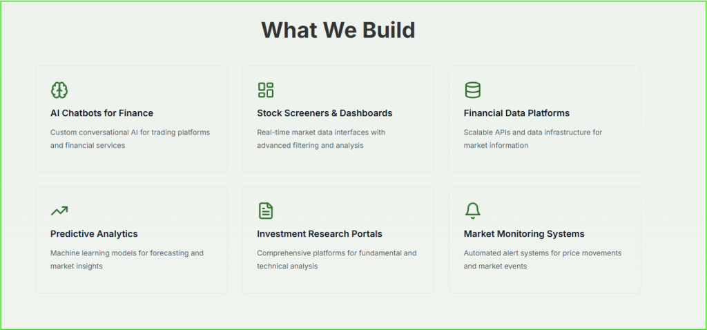 - Custom financial chatbots for trading desks, analysts, and investment firms