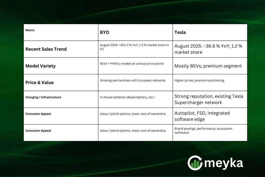 In August 2025, Tesla’s sales in the EU dropped by 36.6 % year over year. Its market share shrank from 2.0 % to about 1.2 %. Meanwhile, BYD rose to a 1.3 % share by the same metric.