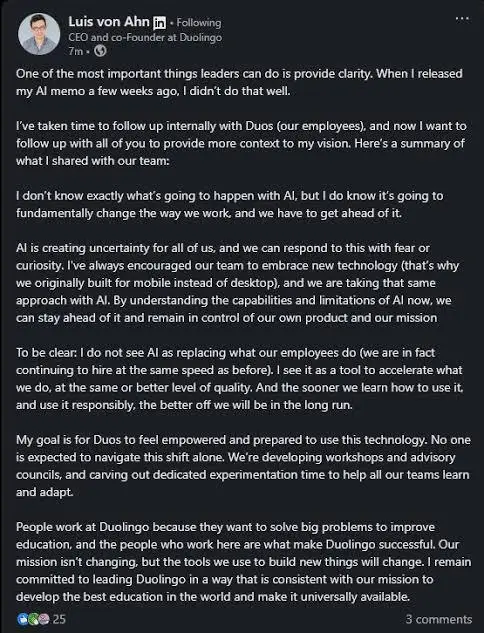 Von Ahn’s memo, shared internally and later posted on LinkedIn, explained that Duolingo would “gradually stop using contractors to do work that AI can handle.” It also said headcount would grow only if automation couldn’t take over those tasks. The goal, he claimed, was to remove bottlenecks and have staff focus on more creative, meaningful work.