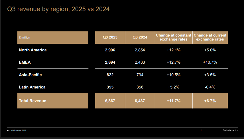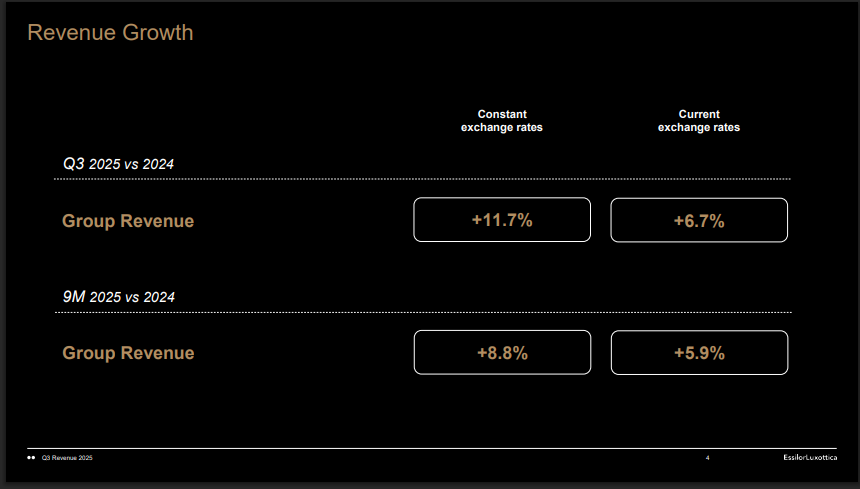 EssilorLuxottica reported third-quarter revenue of about €6.9 billion for Q3 2025. That was an 11.7% rise year-on-year and the company’s best quarterly result to date. Management said online sales and direct-to-consumer channels accelerated strongly during the quarter.