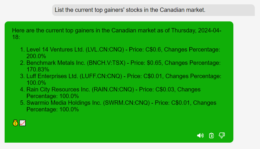 “List the current top gainers’ stocks in the Canadian market.”