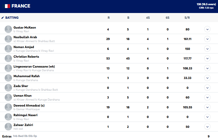 Despite a promising start, frequent wickets prevented France from building a match winning partnership.