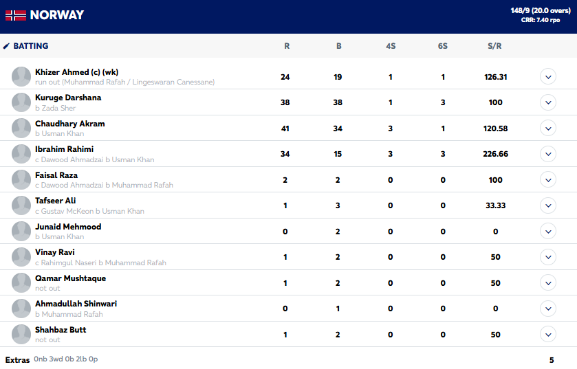 Norway maintained steady partnerships but lost wickets regularly in the final overs. The batting collapse in the last two overs prevented a larger total.