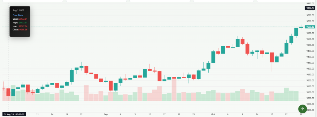 The FTSE 100 traded mixed on 28 October 2025. It hovered near recent highs and showed little net direction by late afternoon. Trading was choppy as investors digested fresh retail data and recent record levels for some blue-chip stocks. The index moved in a narrow range, with financials and miners pushing parts of the market higher while some consumer names lagged. Market data showed the FTSE hovering around the mid-9,600s on the day.
