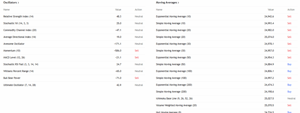 Key support sits near the 24,700-24,800 zone. This band is close to the 200-day moving average on many charts. Immediate resistance shows up around 25,000-25,100. Shorter moving averages, 20 and 50 DMA, are flattening. The daily RSI is below the overbought zone. MACD is neutral to mildly bearish on short timeframes. Low volumes on the slip suggest range trading is likely unless a big trigger appears. Traders should watch intraday pivot levels for quick trades. For deeper scans, some may use an AI stock research analysis tool to spot momentum shifts faster.