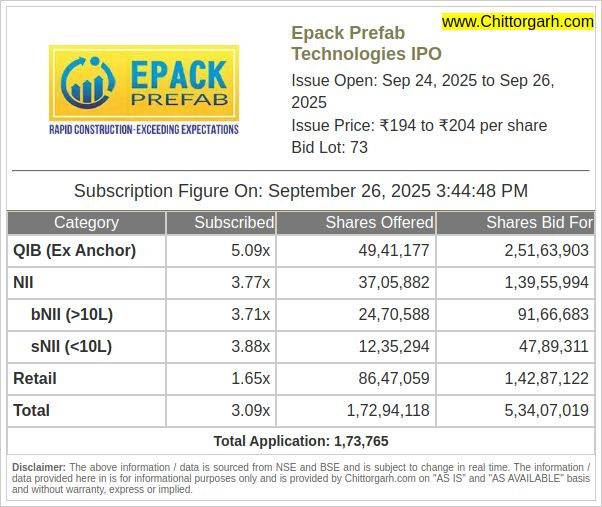 On September 25, 2025, the Epack Prefab IPO was subscribed around 0.59 times. Retail bids were active, while institutional and HNI demand built more slowly.