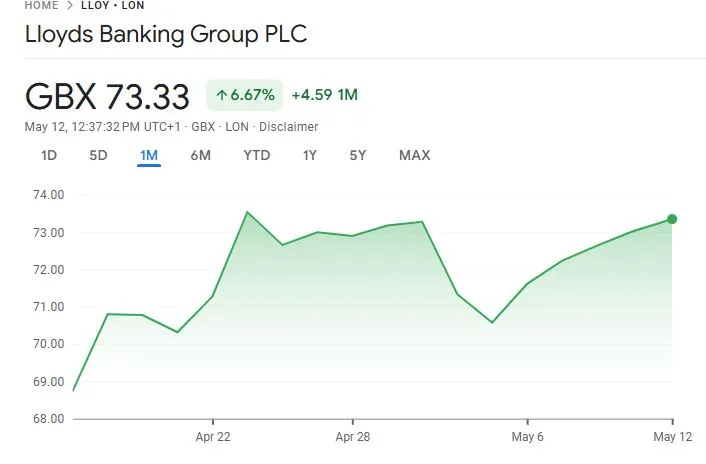 As of May 12, 2025, Lloyds Banking Group’s share price is £73.46. This is a small increase from the previous day, showing that investors trust the company. Over the last month, the stock has stayed between £70 and £75, showing stability in a market that can be unpredictable.