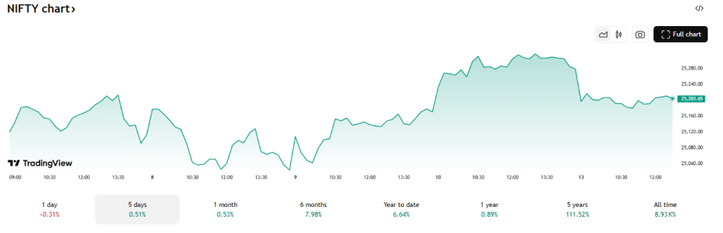 The Nifty 50 showed a mixed start to the week and slipped from recent highs on October 13, 2025. Markets reacted to renewed global tensions and a general risk-off mood. The index traded around the 25,200 zone after a small fall in the morning session. Domestic investors watched global cues closely as U.S.-China trade headlines weighed on sentiment. The intraday moves mirrored broader Asian weakness and a softer rupee.