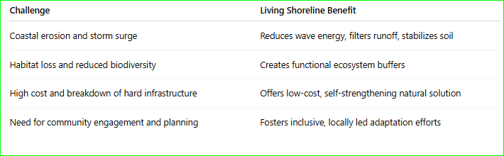 Living shorelines offer multiple benefits, they help habitat, store carbon, and boost biodiversity, while becoming more resilient over time. Hard infrastructure lacks that flexibility and ecological value. They also align with nature’s rhythms, so they support life instead of impeding it..
