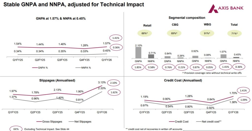 - Sharply rising slippages: Gross NPAs rose to 1.57% from 1.28%. Net NPA moved up to 0.45%, and slippages jumped 72% sequentially to ₹8,200 crore.