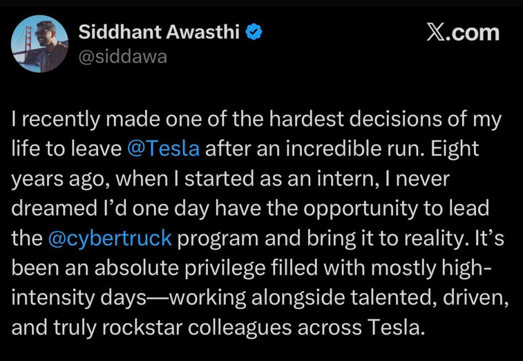 While Tesla did not publicly offer a detailed reason, multiple reports say Awasthi departed after more than eight years at the company and specifically after leading the Cybertruck programme through engineering to production.