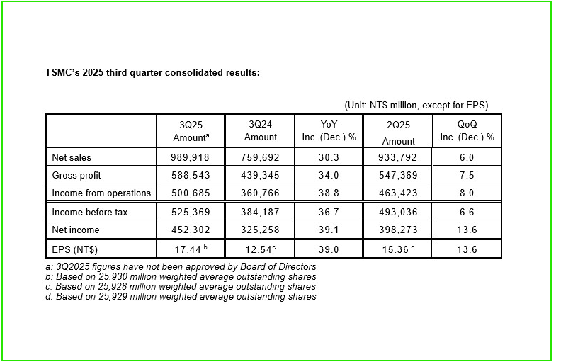 “TSMC’s 3rd quarter revenue rose 30.3% year-on-year to a fresh record high NT$989.9 billion, beating guidance.”